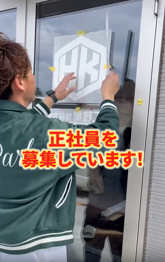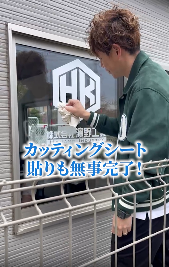 動画では、代表が新しい事務所のドアガラスに、社名の入ったカッティングシート(ステッカー)を貼る様子が映されています。