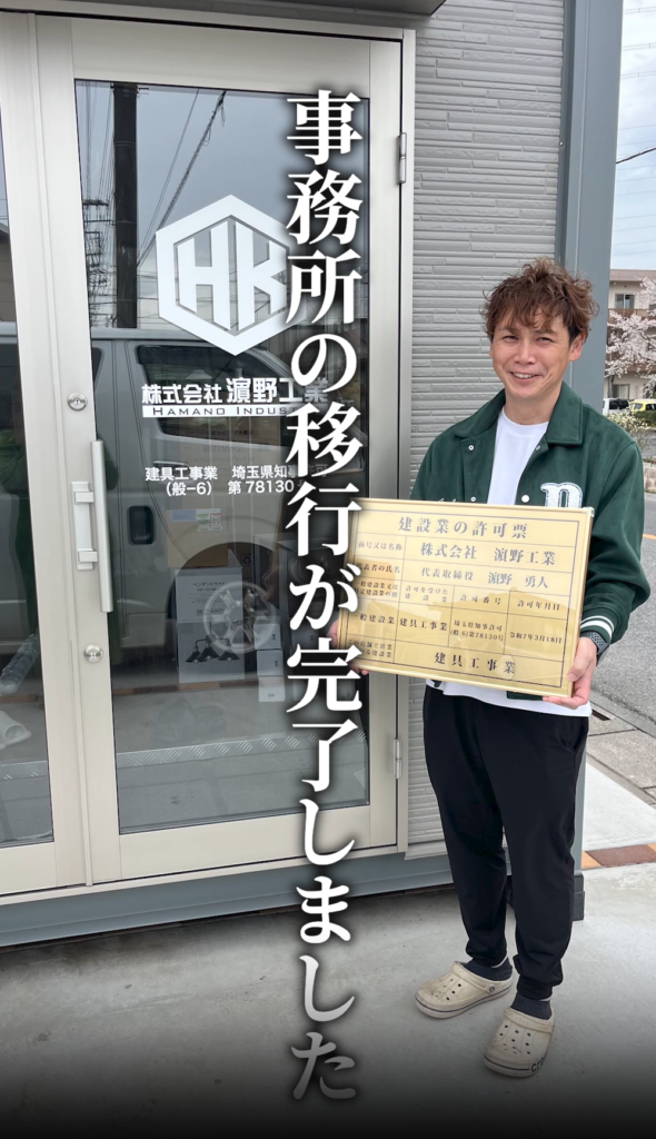 そして、きれいに貼り終えた後の晴れやかな笑顔! 建設業の許可票(金看板)を手にした姿からは、**「ここからまた新しい歴史を作るぞ」**という決意が伝わってきます。